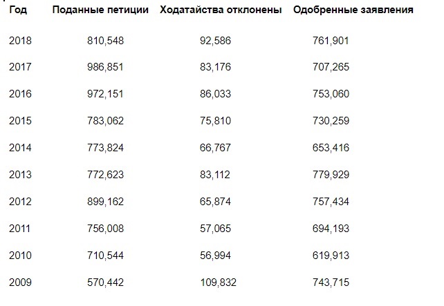С 2009 по 2018 год в среднем было отклонено около 78 000 заявлений о натурализации (их число ежегодно меняется).
