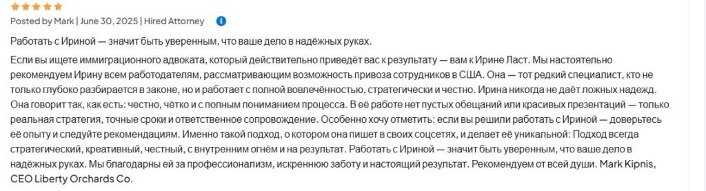 Мы настоятельно рекомендуем Ирину всем работодателям, рассматривающим возможность привоза сотрудников в США.